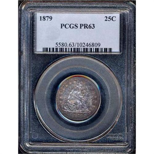 <b>1879 Liberty Seated Quarter Dollar. PCGS graded Proof 63.</b> A sparkling fresh Proof 63 with nicely toned surfaces and a commanding strike. In fact, the stars, Liberty, and eagle are as sharp as the proverbial "two-edged sword" on this attractive coin. Only 1,100 pieces minted <b>(PCGS # 5580)</b> <i>