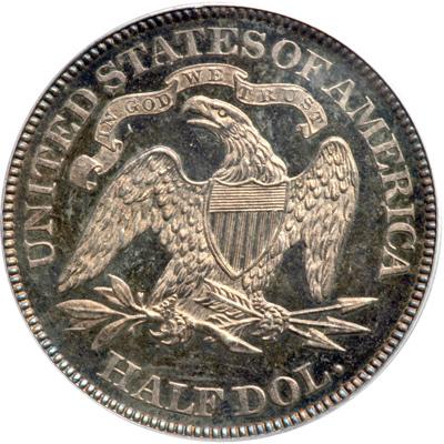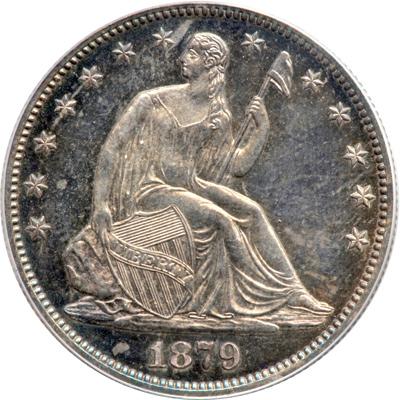1879 Liberty Seated Half Dollar. PCGS graded Proof 64. Only 1,100 Proofs made. And a solid Proof 64 it is, bearing the quality one likes to see for this actively collected seated Liberty denomination. Swirling mirror-deep luster butts up against the sharp frosted highlights on surfaces that almost approach gem quality. This handsome coin should bring a smile to the face of the successful bidder (PCGS # 6440) .