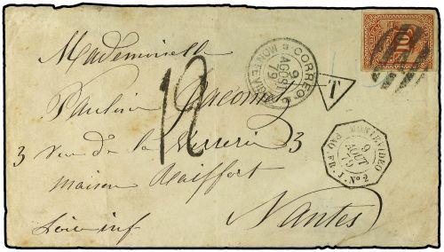 1879 MONTEVIDEO a FRANCIA. 10 cts. rojo y fechador octogonal francés MONTEVIDEO/PAQ. FR. J Nº2. Tasada a la llegada con "12" décimas.