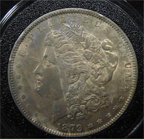 1879 U.S. MORGAN SILVER DOLLAR. Coin is in circular case.