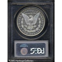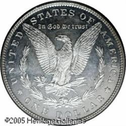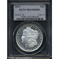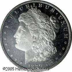 <B>1879<img border='0' src='http://www.heritagecoins.com/images/star.gif' width=10 height=10>$1 MS65 Deep Mirror Prooflike PCGS.</B></I> Although the 1879 has a mintage of close to 15 million pieces and Mint State examples are common, Gems are comparatively scarce and Deep Mirror Prooflike Gems are very rare. The DMPL status of this needle-sharp Gem is irrefutable, and the devices exhibit pleasing cameo frost. Further, unlike most 1879 Silver Dollars with or without mirrored fields, the surfaces are free from any detrimental marks. Population: 5 in 65, 1 finer (1/05).<BR><I>From The Banks Collection.</B></I> Lot:9922