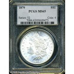 <B>1879<img border='0' src='http://www.heritagecoins.com/images/star.gif' width=10 height=10>$1 MS65 PCGS.</B></I> Well struck and untoned, with bright frosty surfaces that only show a few superficial abrasions on either side. Lot:9917