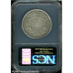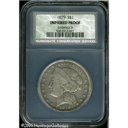 <B>1879<img border='0' src='http://www.heritagecoins.com/images/star.gif' width=10 height=10>$1 Metric Dollar, Judd-1618, Pollock-1813, R.3, Impaired Proof, Damaged, NCS.</B></I> William Barber's Metric Dollar with Liberty wearing a coronet with a border of pearls. The reverse is quite elaborate with a partial wreath of cotton and corn tied at the base, a ribbon, and with DEO EST GLORIA on a tablet above. Struck in standard silver with a reeded edge. Pollock assigns the same attribution to both Judd-1617 and Judd-1618 with the explanation that "Metric alloy cannot be distinguished from standard alloy by either color or sonority." A well worn example, the surfaces of this coin are toned a silver-gray, and reveal a lengthy scratch extending from star 7 across the bridge of Liberty's nose and cheek to the lower neck. The rims on each side exhibit a few punch marks. Lot:9869