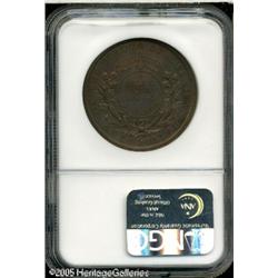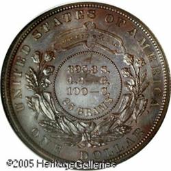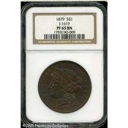 <B>1879<img border='0' src='http://www.heritagecoins.com/images/star.gif' width=10 height=10>$1 Metric Dollar, Judd-1619, Pollock-1814, R.6-7, PR65 Red and Brown NGC.</B></I> William Barber's Metric Dollar with Liberty wearing a coronet with a border of pearls. The reverse is quite elaborate with a partial wreath of cotton and corn tied at the base, a ribbon, and with DEO EST GLORIA on a tablet above. Struck in copper with a reeded edge. A meticulously struck Gem that is richly toned in orange, sea-green, and rose-violet colors. A pair of minor handling marks on Liberty's neck are all that precludes a higher grade.<BR><I>From The Mike Jacobson Collection.</B></I> Lot:9870