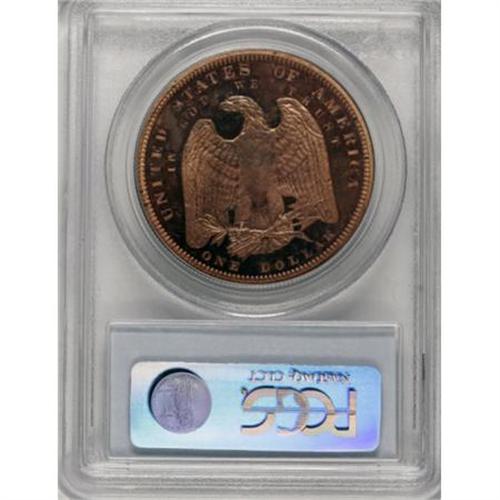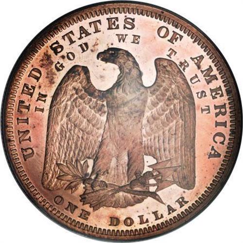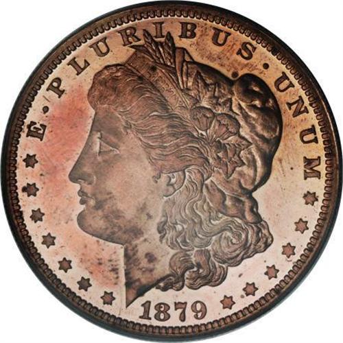 <B>1879 $1 Morgan Dollar, Judd-1614, Pollock-1810, Low R.7, PR64 Red Cameo PCGS.</B></I> A regular issue Morgan dollar obverse is paired with a pattern reverse. The eagle is large and has its open wings set lower in the field. ONE DOLLAR is in small letters, and IN GOD WE TRUST is widely spread along the upper periphery. Struck in copper with a reeded edge. An orange-red near-Gem with an impressively sharp strike. Contact is limited to the field right of the eagle's neck, and carbon is equally unimportant.<BR><BR><b>Shipping:</b> Coins & Currency (<a target="_blank" href="http://www.heritageauctions.com/common/shipping.php">view shipping information</a>)