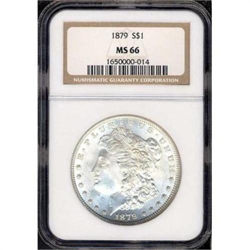 <b>1879 Morgan Dollar. NGC graded MS66.</b> Swirls of silvery cartwheel luster with richer texture than average for a scarcer P-mint 1879. A first-rate Gem <b>(PCGS # 7084)</b> <i>