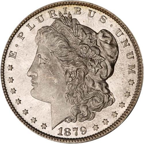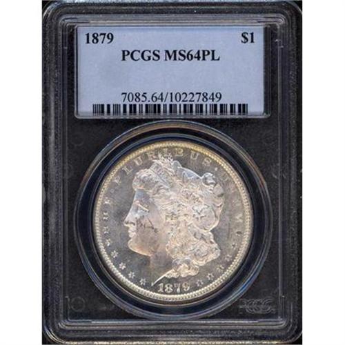 <b>1879 Morgan Dollar. PCGS graded MS64 PL.</b> A tiny scuff in the frost of the cheek. Pleasant satin to prooflike reflection envelops all surfaces under its silvery radiance, with no toning. Desirable with this controlled strike on the devices <b>(PCGS # 7085)</b>