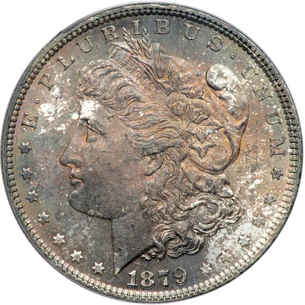 1879 Morgan Dollar. PCGS graded MS-64. Both sides feature multi-color toning (PCGS # 7084) .