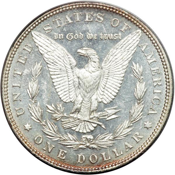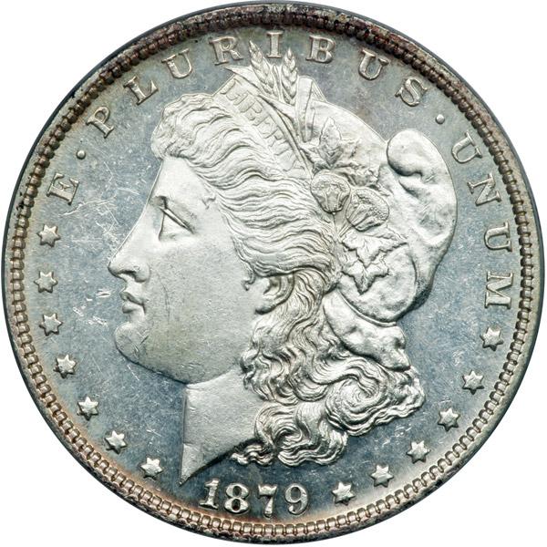 1879 Morgan Dollar. PCGS graded MS-62 Prooflike. Mostly untoned, the fields, which are reflective, give support to the frosted devices on both sides of this well struck coin (PCGS # 7085) .