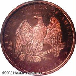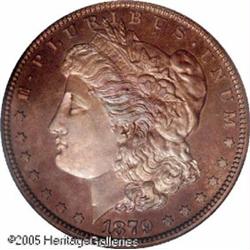 <B>1879<img border='0' src='http://www.heritagecoins.com/images/star.gif' width=10 height=10>$1 Morgan Dollar, Judd-1616, Pollock-1812, R.6-7, PR66 Red PCGS.</B></I> From the regular issue obverse die for the 1879 Morgan Dollar, while the reverse features an eagle with lowered and spread wings. The eagle holds a large olive branch and a trio of large arrows in its talons. Struck in copper with a reeded edge. A needle-sharp Gem with vivid copper-red color and flashy mirrored fields. A couple of tiny toning spots visit the unmarked surfaces, including one on the eagle's neck. This is only singled out as a future identifier. PCGS has only graded 10 examples of this desirable pattern in all grades and colors, just two of which have retained their full Red color. This is the single finest example (1/05).<BR><I>From The Bruce Scher Collection.</B></I> Lot:9868