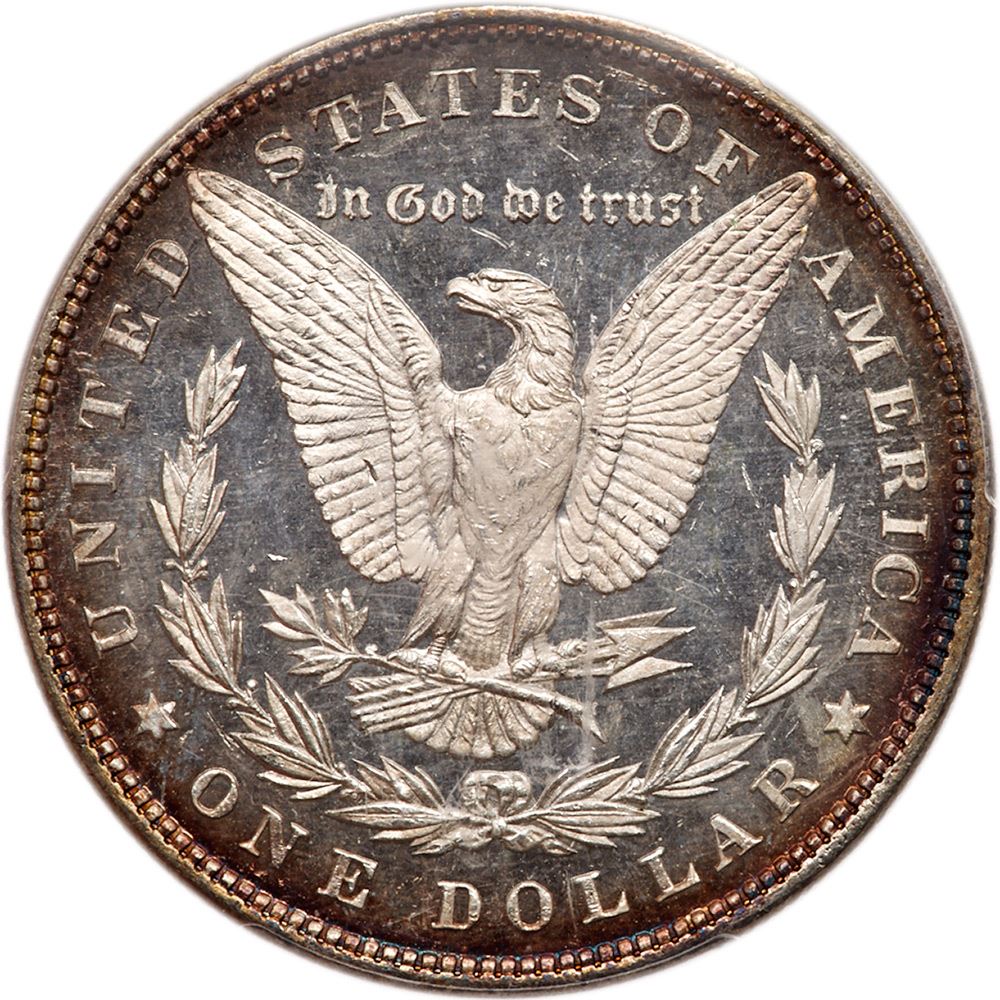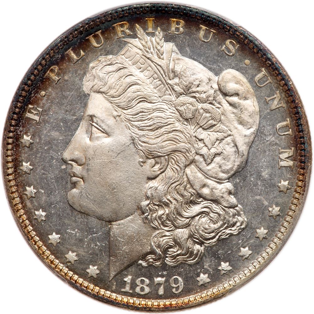 1879. PCGS graded MS-65 Deep Mirror Prooflike. Blazing mirror fields combine with satiny devices combine to make eye appealing surfaces. Rarely encountered in gem condition, this date will certainly please any specialist who demands bold visual appeal. Delicate peripheral toning. Pop 8; 5 finer at PCGS for DMPL, 1 in 65+, 4 in 66. PCGS # 97085 Estimated Value 10,000 - 11,000