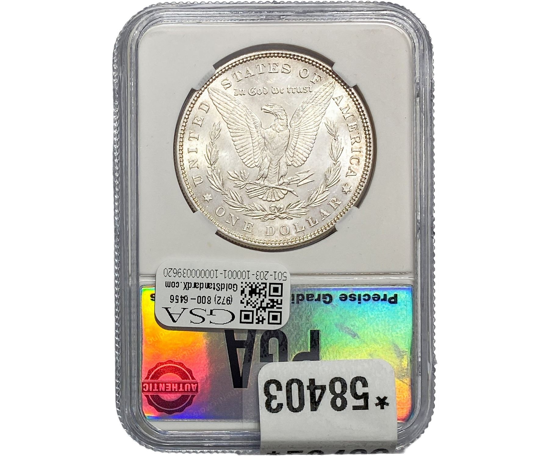 e. Coins sold referencing a third-party grading service are sold “AS IS” without any express or implied warranty, except for a guarantee by GSA that they are genuine. Removal or alteration of the holder, voids all of Bidder’s claims concerning that Product. Certain warranties may be available from the grading services and Bidders are referred to them for further details: Numismatic Guaranty Corporation (NGC), PO Box 4776, Sarasota, FL 34230, www.ngccoin.com/services/writtenguarantee.asp; Professional Coin Grading Services (PCGS), PO Box 9458, Newport Beach, CA 92658, www.pcgs.com/guarantee.html; ANACS, 6555 S. Kenton St., Ste. 303, Englewood, CO 80111; and Independent Coin Grading Co. (ICG), 7901 East Bellview, Ave., Suite 50, Englewood, CO 80111.