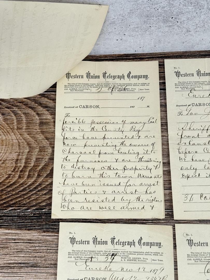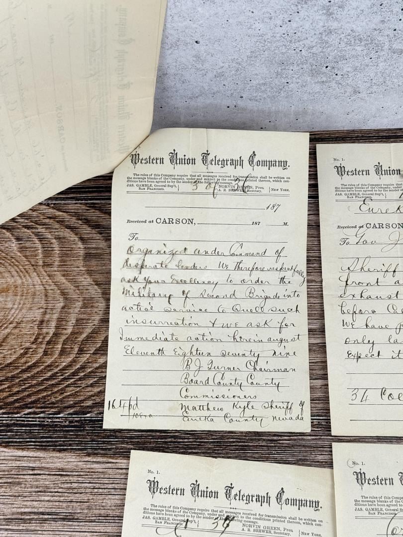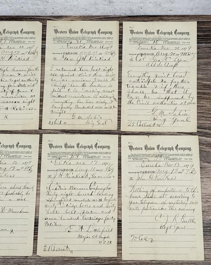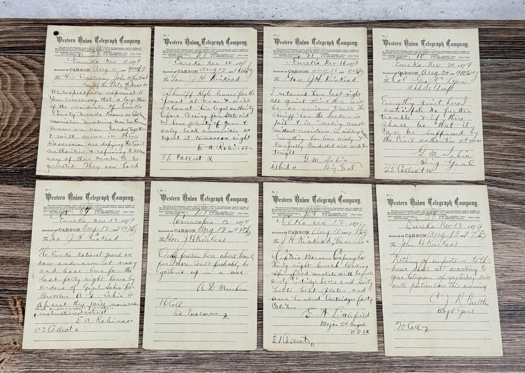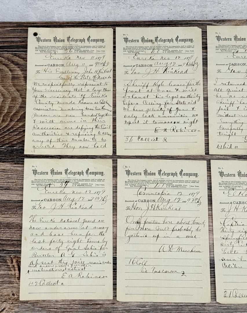 Collection of eight telegrams sent to Nevada Governor John H Kinkead in 1879 regarding The labor unrest in Eureka that resulted in the Fish Creek Massacre that killed five Italian immigrants. An interesting and important piece of Nevada history.