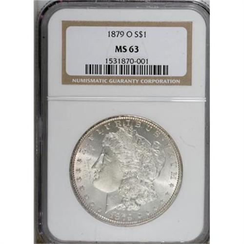 <B>1879-O $1 MS63 NGC.</B></I> NGC Census: (1494/1231). PCGS Population (2359/1825). Mintage: 2,887,000. Numismedia Wsl. Price for NGC/PCGS coin in MS63: $146. (#7090)<BR><BR><B>Coin Engraver:</B> George T. Morgan<BR><BR><b>Shipping:</b> Coins & Currency (<a target="_blank" href="http://www.heritageauctions.com/common/shipping.php">view shipping information</a>)