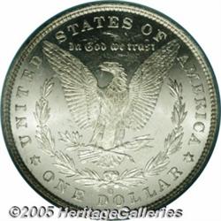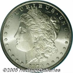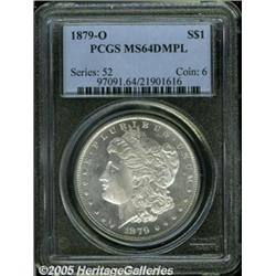 <B>1879-O<img border='0' src='http://www.heritagecoins.com/images/star.gif' width=10 height=10>$1 MS64 Deep Mirror Prooflike PCGS.</B></I> The 1879-O dollar is plentiful in lower Mint State levels from MS60 through MS63, but becomes scarce to rare in higher grades. Deep mirror prooflike examples are rarer yet. Indeed, PCGS has certified only 26 specimens in MS64 DMPL, with a mere two finer. This is a bright, untoned example with pleasing cameo contrast on both sides, and exquisitely struck design elements. The scattered abrasions include a moderate graze on Liberty's cheek.