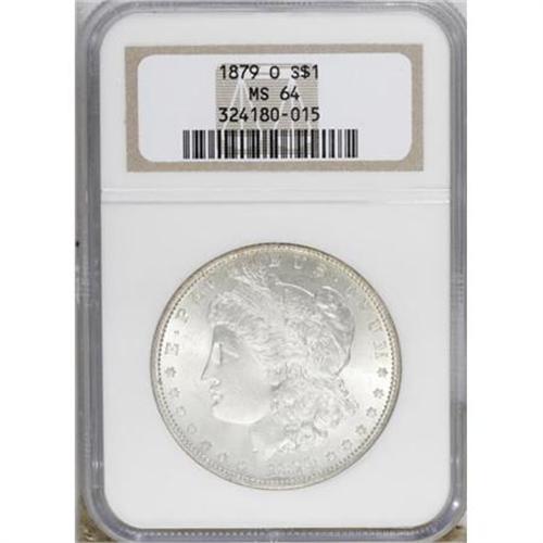 <B>1879-O $1 MS64 NGC.</B></I> NGC Census: (1103/127). PCGS Population (1575/284). Mintage: 2,887,000. Numismedia Wsl. Price for NGC/PCGS coin in MS64: $420. (#7090)<BR><BR><B>Coin Engraver:</B> George T. Morgan<BR><BR><b>Shipping:</b> Coins & Currency (<a target="_blank" href="http://www.heritageauctions.com/common/shipping.php">view shipping information</a>)