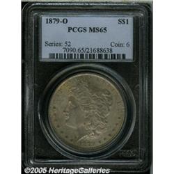 <B>1879-O<img border='0' src='http://www.heritagecoins.com/images/star.gif' width=10 height=10>$1 MS65 PCGS.</B></I> Sharply struck and fully lustrous. The obverse has deep heather and iridescent toning with full silvery-white brilliance on the reverse. This is an attractive and highly desirable Gem. Population: 155 in 65, 9 finer (2/05).