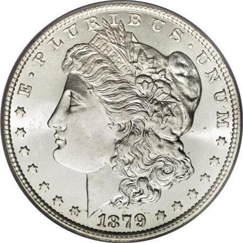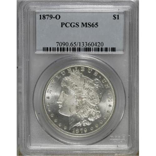<B>1879-O $1 MS65 PCGS.</B></I> This amazing Gem has fully brilliant silver surfaces, frosty luster, and bold design features. Like so many Morgan dollars, it is a condition rarity, with only 11 finer PCGS certified examples of the date. When examples were first coined, few were released into circulation, most being stored in sealed bags that were eventually transferred to the Treasury in Washington, D.C. Between moving and annual inventory procedures, the majority of stored coins became bagmarked, with few pristine survivors.<BR><BR><B>Coin Engraver:</B> George T. Morgan<BR><BR><b>Shipping:</b> Coins & Currency (<a target="_blank" href="http://www.heritageauctions.com/common/shipping.php">view shipping information</a>)