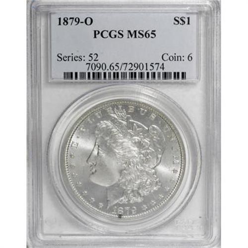 <B>1879-O $1 MS65 PCGS.</B></I> This penetratingly struck Gem provides dynamic luster and has only a trace of gold toning. The obverse is remarkably unabraded, although a tiny spot is noted below the 8 in the date. The reverse has only unimportant grazes on the field beneath the wings.<BR><I>From The Silver Spur Collection of Morgan Dollars.</B></I><BR><BR><B>Coin Engraver:</B> George T. Morgan<BR><BR><b>Shipping:</b> Coins & Currency (<a target="_blank" href="http://www.heritageauctions.com/common/shipping.php">view shipping information</a>)