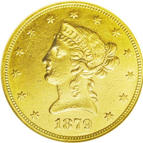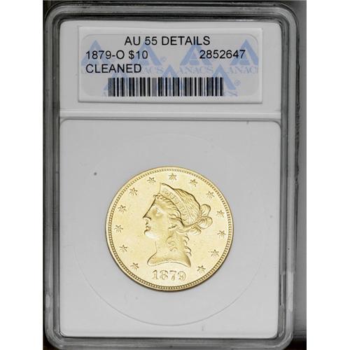 <B>1879-O<$10>--Cleaned--ANACS. AU55 Details.</B></I> The first O-mint eagle since the onset of the Civil War and an elusive issue in all grades. The bright yellow surfaces exhibit numerous abrasions indicative of a large gold coin. In addition, numerous hairlines attest to the obvious cleaning that removed some of the natural color this coin may have retained after its stint in circulation. Nonetheless, this survivor from an original issue of only 1,500 pieces should still elicit strong bids when it crosses the auction block.