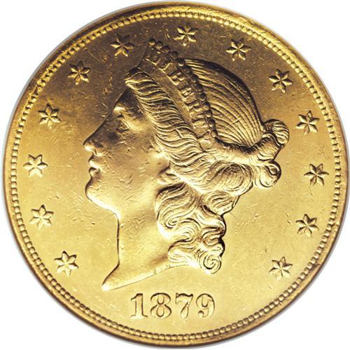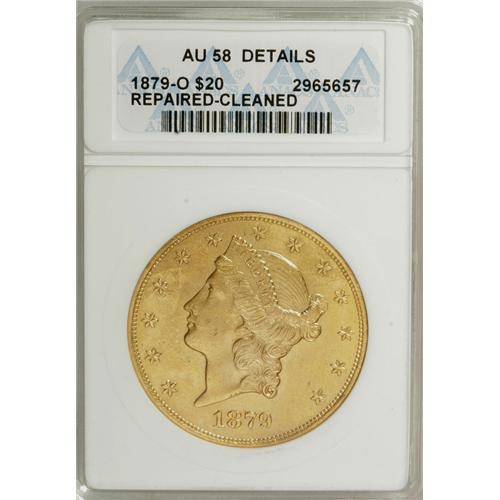 <B>1879-O $20 --Repaired, Cleaned--ANACS. AU58 Details.</B></I> This is one of the most important dates in the entire Liberty double eagle series, the only issue of the Type Three design modification coined in New Orleans, and the mintage was a minuscule 2,325 coins, one of the smallest production totals of any issue. The New Orleans Mint reopened in 1879 after being dormant through the Civil War and for more than an additional decade after the war was over. Clearly this Louisiana Mint was concentrating on production of Morgan dollars during the year, much like every other Mint that was then in use. This sharply struck example has highly lustrous green-gold surfaces with reflective fields. There is little evidence of either cleaning or repair on the obverse and reverse surfaces of this rarity.<BR><BR><b>Shipping:</b> Coins & Currency (<a target="_blank" href="http://www.heritageauctions.com/common/shipping.php">view shipping information</a>)