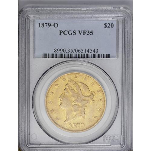 <B>1879-O<$20> VF35 PCGS.</B></I> Just after the beginning of the Civil War, the New Orleans Mint was captured by the Confederacy, and operated by them for a brief period of time before being shut down entirely in 1861. This facility did not reopen for coinage until 1879, and production continued until 1909, mostly for silver dollars and lower denomination coins. In fact, the 1879-O double eagle was the last issue of the denomination to be struck in Louisiana, thus it is the only Type Three example from this Mint. Further, the mintage of this issue was a mere 2,325 coins, meaning few have survived. This example has pleasing surfaces for the grade, with attractive medium yellow color. The fields retain traces of luster. Overall, it is an attractive and desirable example.
