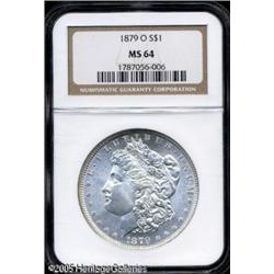 <B>1879-O<img border='0' src='http://www.heritagecoins.com/images/star.gif' width=10 height=10>$1 MS64 NGC.</B></I> Well struck and untoned, with a lovely combination of frosty and satiny luster, several peripheral die cracks (as struck), and a few minor contact marks and luster grazes. Lot:9942