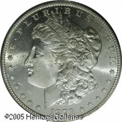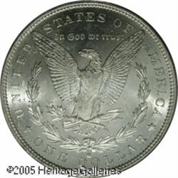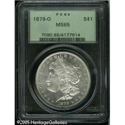 <B>1879-O<img border='0' src='http://www.heritagecoins.com/images/star.gif' width=10 height=10>$1 MS65 PCGS.</B></I> A very scarce and always popular Morgan Dollar that is readily available in lower grades, but because of heavy bagmarking is seldom seen in Gem condition. This is a sharply struck coin that exhibits strong mint frost and a brilliant white finish over both sides. A special opportunity for the Morgan specialist. Population: 153 in 65, 9 finer (1/05). Lot:9944
