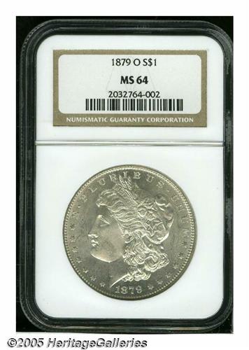 <B>1879-O<S$1> MS64 NGC.</B></I> Well struck and carefully preserved, with a clean cheek and just a few superficial field grazes on each side. The fields exhibit semi-prooflike reflectivity.