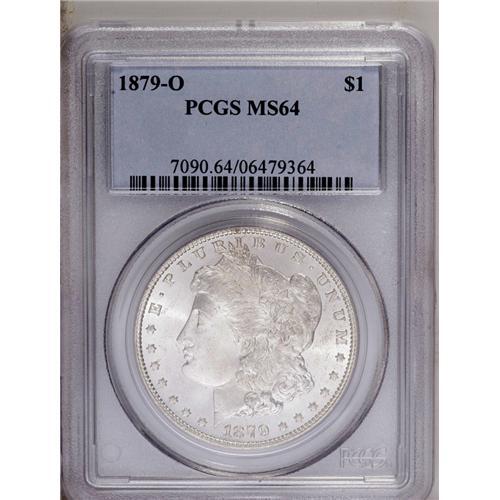 <B>1879-O<img border='0' src='http://www.heritagecoins.com/images/star.gif' width=10 height=10>$1> MS64 PCGS.</B></I> Wisps of pale blue toning on the reverse give color to this otherwise brilliant near-Gem. Sharply struck and lightly frosted with pleasing luster.