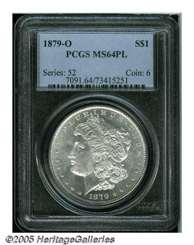 <B>1879-O<S$1> MS64 Prooflike PCGS.</B></I> A reflective, untoned example contrasted nicely by fully struck, frosty devices. Scarce New Orleans issue with this combination of prooflike fields and near-Gem quality. Population: 28 in 64 Prooflike, 2 finer (5/05).