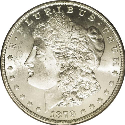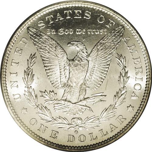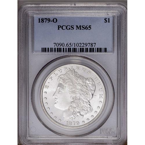 <B>1879-O<img border='0' src='http://www.heritagecoins.com/images/star.gif' width=10 height=10>$1> MS65 PCGS.</B></I> An essentially brilliant Gem that benefits from potent luster and a crisp strike in the centers. The absence of bagmarks only increases the eye appeal. The 1879-O is only a slightly better date in lower Mint State grades, but Gems are surprisingly scarce.