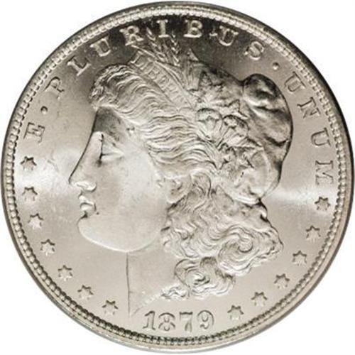 <B>1879-O<img border='0' src='http://www.heritagecoins.com/images/star.gif' width=10 height=10>$1> MS65 PCGS.</B></I> Apparently a large percentage of the mintage of the 1879-O was paid out into circulation shortly after striking. High grade examples, and especially those with minimal abrasions, are extremely elusive, and the issue is decidedly rare in Gem condition. This brilliant coin has glowing mint luster and is well defined overall. The cheek of Liberty is especially clean, with a few minor abrasions and luster grazes in the left obverse field.
