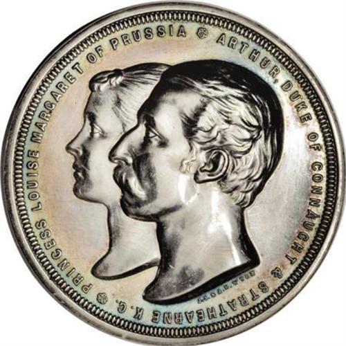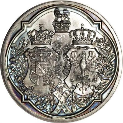 <B>1879 Marriage of Prince Arthur and Princess Louise Medal.</B></I> BHM 3052, Eimer 1662. Silver, 64 mm, 154.7 gm. Prince Arthur, Duke of Connaught and Strathearne married Princess Louise Margaret of Prussia on March 13, 1879. This majestic medal commemorates that event. Conjoined busts facing left on the obverse and signed J.S. & A.B. WYON at the truncation. An elaborately detailed reverse features a dual coat of arms. Light hairlines on the obverse indicates a light cleaning of that side, although the entire medal has toned in a blend of blues and rose, thus concealing surface imperfections. The reverse is a stunning display of electric-blue and lavender iridescence atop nicely mirrored fields. A slight rim bruise at 10 o'clock on the obverse is noted only for the sake of full disclosure.<BR><BR><b>Shipping:</b> Coins & Currency (<a target="_blank" href="http://www.heritageauctions.com/common/shipping.php">view shipping information</a>)