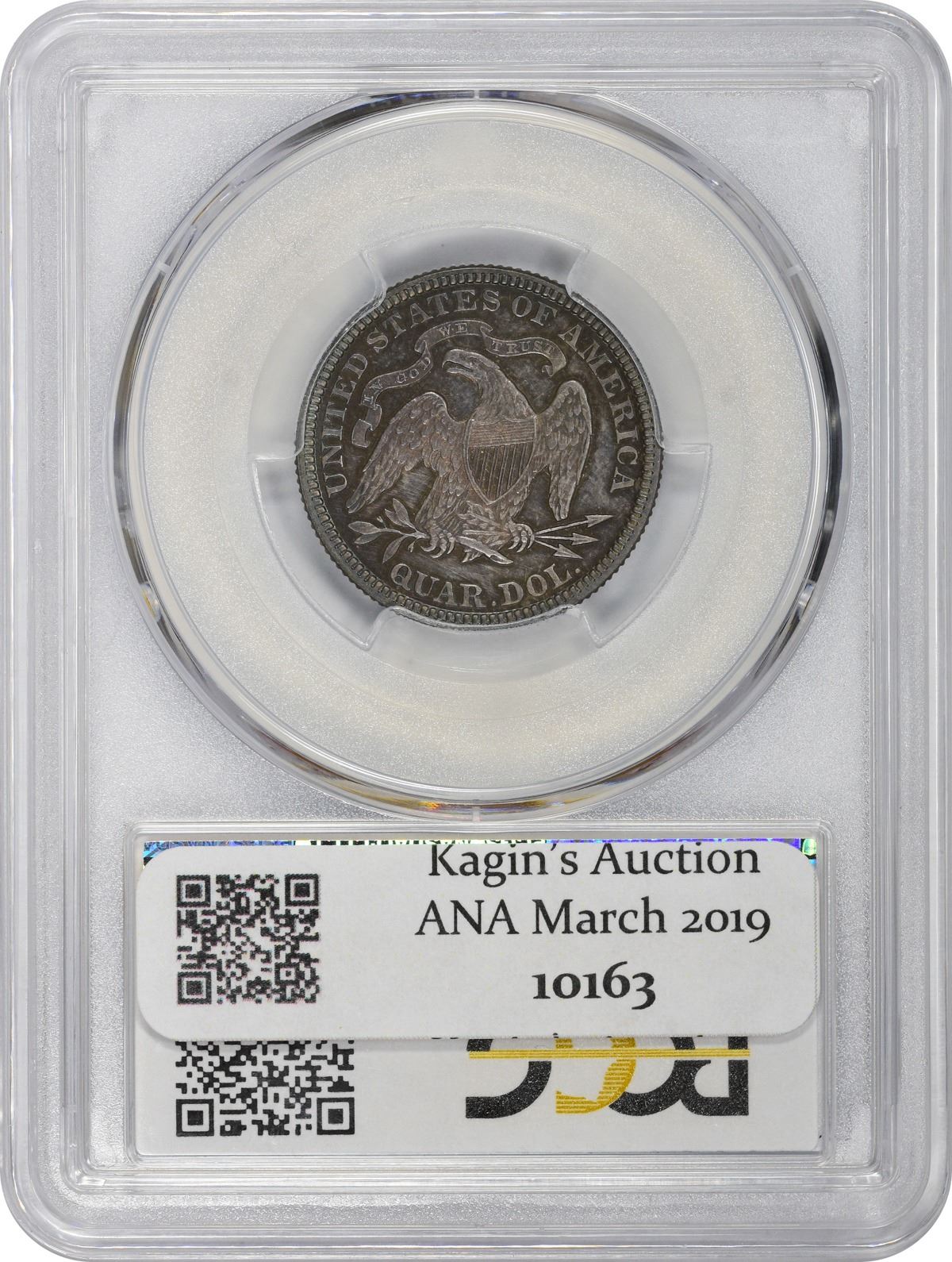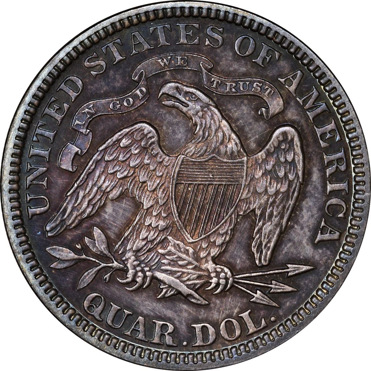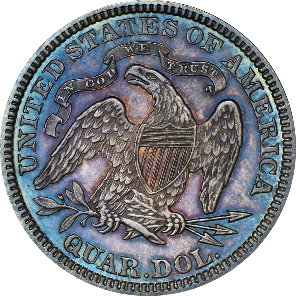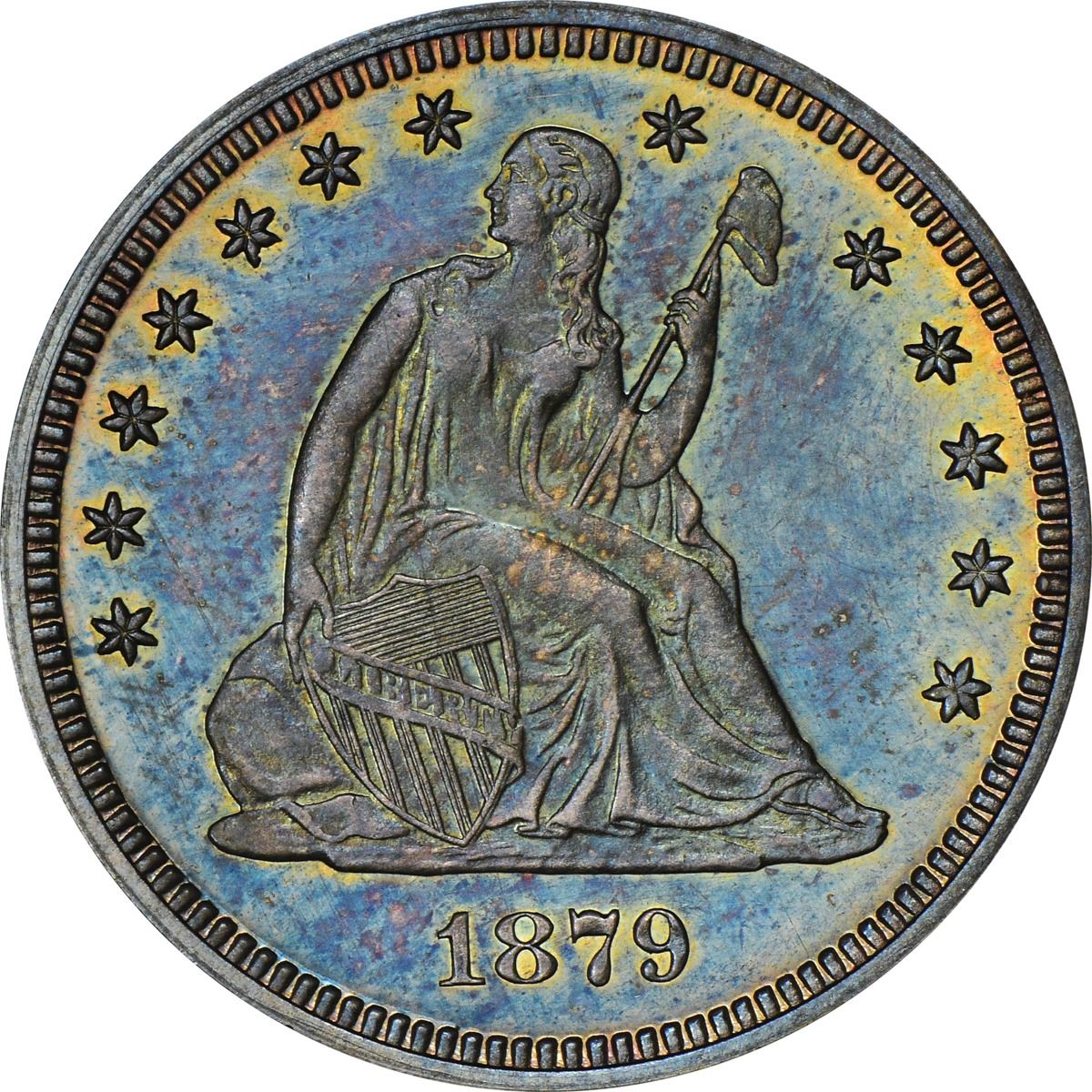 The reflective obverse field and frosty devices are virtually alive with intense electric blue iridescence while the reverse devices display some lively rose-gold toning at the center. The tally for Proofs of the date was high this year, 1,100 pieces in fact, owing to a speculative bubble in Proof coins during the era that echoed across most denominations. Reverse die lump at center between crossbars 7 and 8 in the shield, another die lump near eagle’s eye. PCGS #5580