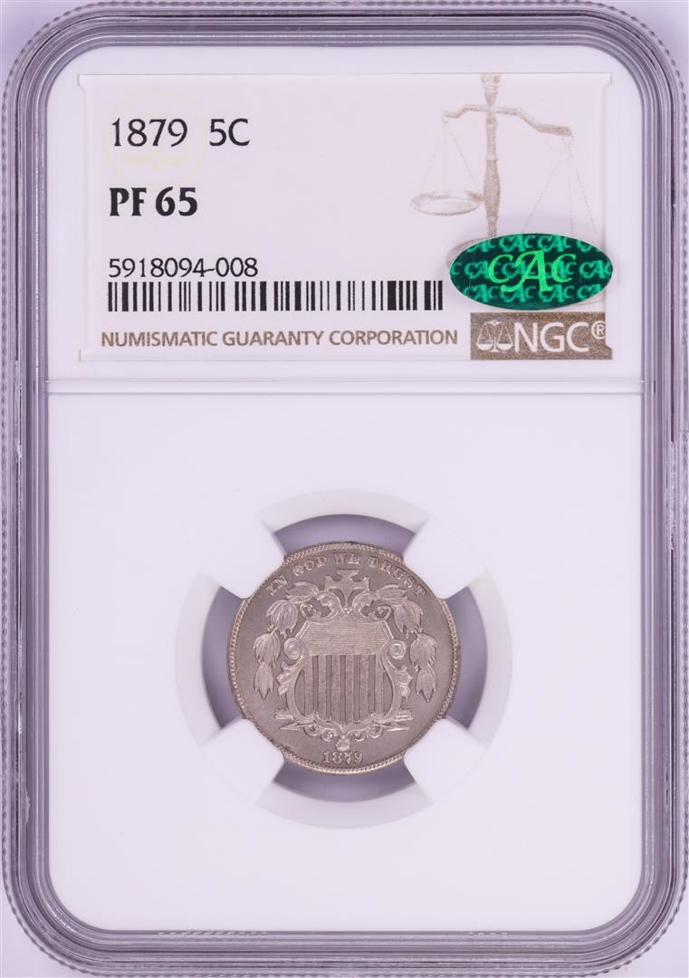 One 1879 Proof Shield Nickel Coin NGC PF65 CAC. NGC Certified.