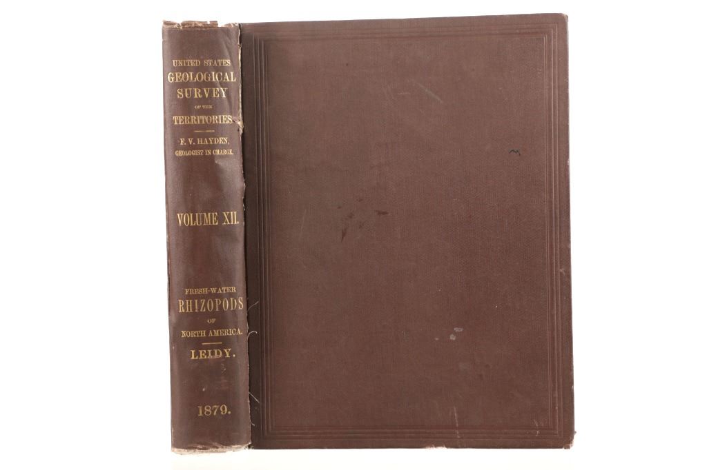 Featured in this lot is this 1879 issue of The Department of the Interior Report of the United States Geological Survey of The Territories by F.V. Hayden, United States Geologist-In-Charge Volume XII. This book was published by Washington Government Printing Office 1879. The condition of this book shows a repair to the spine and some wear to cloth wrapping to the outside cover and shows browning to the pages consistent with the age of the book. The measurements of this book is 11 7/8" x 9 3/8". The collective weight of this book is 6lb 4oz.