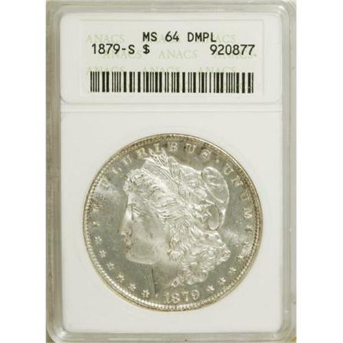 <B>1879-S $1 MS64 Deep Mirror Prooflike ANACS.</B></I> NGC Census: (198/134). PCGS Population (284/192). Numismedia Wsl. Price for NGC/PCGS coin in MS64: $260. (#97093)<BR><BR><b>Shipping:</b> Coins & Currency (<a target="_blank" href="http://www.heritageauctions.com/common/shipping.php">view shipping information</a>)