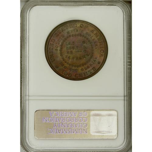 <B>1879 S$1 Goloid Metric Dollar, Judd-1632, Pollock-1829, R.7, PR65 Red and Brown NGC.</B></I> George Morgan's design for a goloid metric dollar with the bust of Liberty facing left on the obverse, hair braided and coiled at the back of her head, E PLURIBUS UNUM above and the date 1879 below, with stars on the left and right side. On the reverse, the elemental components are central to that side and surrounded by a small circle of stars, and two other circles of statutory requirements between the stars and the rim. Struck in copper with a reeded edge. This example boasts a beautiful palette of colors ranging from yellow through lilac to fuchsia. The fields are highly reflective, and there is good though uncredited cameo contrast. A pretty Gem example of this historic pattern issue.<BR><BR><b>Shipping:</b> Coin/Currency (<a target="_blank" href="http://www.heritageauctions.com/common/shipping.php">view shipping information</a>)