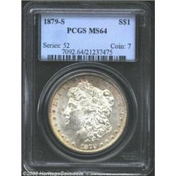<TR><TD width="100%"><TABLE cellSpacing=1 cellPadding=3 width="100%" border=0><TBODY><TR><TD width="100%" bgColor=#79735c><FONT face=arial color=#ffffff size=3><B>Description</B> </FONT></TD></TR><TR><TD width="100%" bgColor=#ffffff><FONT face=arial size=2><B>1879-S $1 MS64 PCGS.</B></I> The reverse has luxurious orange-gold, mauve, and navy-blue colors, while the obverse is only faintly toned. A sharply struck near-Gem with a nearly immaculate reverse. </FONT></TD></TR></TBODY></TABLE></TD></TR></TBODY></TABLE><BR><A name=PricesRealized></A><TABLE cellSpacing=0 cellPadding=0 width="100%" bgColor=#000000 border=0><TBODY><TR><TD width="100%"><TABLE cellSpacing=1 cellPadding=3 width="100%" border=0><TBODY><TR><TD width="100%" bgColor=#79735c><A name=PR><FONT face=arial color=#ffffff size=3><B>Previous Prices from Heritage Auctions</B> </FONT></A></TD></TR><TR><TD bgColor=#f6f6ed><TABLE cellSpacing=0 cellPadding=0 width="100%" border=1><TBODY><TR><TD align=middle width="33%"><B>Date</B></TD><TD align=middle width="33%"><B>Service</B></TD><TD align=middle width="33%"><B>Price</B></TD></TR><TR bgColor=whitesmoke><TD width="33%"><B>03/25/2003</B></TD><TD width="33%">PCGS</TD><TD width="33%">$50.60</TD></TR><TR bgColor=whitesmoke><TD width="33%"><B>12/10/2002</B></TD><TD width="33%">PCGS</TD><TD width="33%">$42.55</TD></TR><TR bgColor=whitesmoke><TD width="33%"><B>09/24/2002</B></TD><TD width="33%">PCGS</TD><TD width="33%">$39.10</TD></TR><TR bgColor=whitesmoke><TD width="33%"><B>09/10/2002</B></TD><TD width="33%">PCGS</TD><TD width="33%">$39.10</TD></TR><TR bgColor=whitesmoke><TD width="33%"><B>05/14/2002</B></TD><TD width="33%">PCGS</TD><TD width="33%">$41.40</TD></TR><TR bgColor=whitesmoke><TD width="33%"><B>04/23/2002</B></TD><TD width="33%">PCGS</TD><TD width="33%">$41.40</TD></TR><TR bgColor=whitesmoke><TD width="33%"><B>04/16/2002</B></TD><TD width="33%">PCGS</TD><TD width="33%">$59.80</TD></TR><TR bgColor=whitesmoke><TD width="33%"><B>12/26/2000</B></TD><TD width="33%">PCGS</TD><TD width="33%">$36.00</TD></TR><TR bgColor=whitesmoke><TD width="33%"><B>04/25/2000</B></TD><TD width="33%">PCGS</TD><TD width="33%">$45.00</TD></TR><TR bgColor=whitesmoke><TD width="33%"><B>01/25/2000</B></TD><TD width="33%">PCGS</TD><TD width="33%">$35.00</TD></TR><TR bgColor=whitesmoke><TD width="33%"><B>11/27/2001</B></TD><TD width="33%">PCGS</TD><TD width="33%">$38.00</TD></TR><TR bgColor=whitesmoke><TD width="33%"><B>07/24/2001</B></TD><TD width="33%">PCGS</TD><TD width="33%">$205.00</TD></TR><TR bgColor=whitesmoke><TD width="33%"><B>07/17/2001</B></TD><TD width="33%">PCGS</TD><TD width="33%">$34.00</TD></TR><TR bgColor=whitesmoke><TD width="33%"><B>06/02/2001</B></TD><TD width="33%">PCGS</TD><TD width="33%">$57.50</TD></TR><TR bgColor=whitesmoke><TD width="33%"><B>07/03/2001</B></TD><TD width="33%">PCGS</TD><TD width="33%">$36.00</TD></TR><TR bgColor=whitesmoke><TD width="33%"><B>06/13/2000</B></TD><TD width="33%">PCGS</TD><TD width="33%">$106.00</TD></TR><TR bgColor=whitesmoke><TD width="33%"><B>01/25/2000</B></TD><TD width="33%">PCGS</TD><TD width="33%">$40.00</TD></TR><TR bgColor=whitesmoke><TD width="33%"><B>01/25/2000</B></TD><TD width="33%">PCGS</TD><TD width="33%">$35.00</TD></TR><TR bgColor=whitesmoke><TD width="33%"><B>05/30/2000</B></TD><TD width="33%">PCGS</TD><TD width="33%">$50.00</TD></TR><TR bgColor=whitesmoke><TD width="33%"><B>07/03/2001</B></TD><TD width="33%">PCGS</TD><TD width="33%">$36.00</TD></TR><TR bgColor=whitesmoke><TD width="33%"><B>03/18/2003</B></TD><TD width="33%">NGC</TD><TD width="33%">$40.25</TD></TR><TR bgColor=whitesmoke><TD width="33%"><B>09/17/2002</B></TD><TD width="33%">NGC</TD><TD width="33%">$40.25</TD></TR><TR bgColor=whitesmoke><TD width="33%"><B>06/08/2002</B></TD><TD width="33%">NGC</TD><TD width="33%">$207.00</TD></TR><TR bgColor=whitesmoke><TD width="33%"><B>12/26/2000</B></TD><TD width="33%">NGC</TD><TD width="33%">$36.00</TD></TR><TR bgColor=whitesmoke><TD width="33%"><B>12/19/2000</B></TD><TD width="33%">NGC</TD><TD width="33%">$30.00</TD></TR><TR bgColor=whitesmoke><TD width="33%"><B>03/01/1999</B></TD><TD width="33%">NGC</TD><TD width="33%">$1,265.00</TD></TR><TR bgColor=whitesmoke><TD width="33%"><B>04/24/1999</B></TD><TD width="33%">NGC</TD><TD width="33%">$49.50</TD></TR><TR bgColor=whitesmoke><TD width="33%"><B>12/26/2000</B></TD><TD width="33%">NGC</TD><TD width="33%">$41.00</TD></TR><TR bgColor=whitesmoke><TD width="33%"><B>04/01/2003</B></TD><TD width="33%">NGC</TD><TD width="33%">$37.95</TD></TR><TR bgColor=whitesmoke><TD width="33%"><B>03/26/2002</B></TD><TD width="33%">ANACS</TD><TD width="33%">$41.40</TD></TR><TR bgColor=whitesmoke><TD width="33%"><B>07/17/2001</B></TD><TD width="33%">ANACS</TD><TD width="33%">$37.00</TD></TR><TR bgColor=whitesmoke><TD width="33%"><B>10/17/2000</B></TD><TD width="33%">ANACS</TD><TD width="33%">$40.00</TD></TR></TBODY></TABLE></TD></TR><TR><TD bgColor=#ffffff><FONT face=arial size=1 ?>PLEASE NOTE: All prices realized reflect the final hammer price PLUS the buyer's premium in auctions that charge a buyer's premium. Each item has a notation at the top of the listing indicating whether that lot included a buyer's premium. Example: A item that sells with a final hammer price of $100 and a 20% buyer's premium will display with a price realized of $120. All information listed is intended to be as accurate as possible, but errors are possible. Please use this guide carefully and inform us of any inaccuracies. </FONT></TD></TR></TBODY></TABLE></TD></TR></TBODY></TABLE><BR><TABLE cellSpacing=0 cellPadding=0 width="100%" bgColor=#000000 border=0><TBODY><TR><TD width="100%"><TABLE cellSpacing=1 cellPadding=3 width="100%" border=0><TBODY><TR><TD width="100%" bgColor=#79735c colSpan=6><FONT face=arial color=#ffffff size=3><B>Price Guide*</B> </FONT></TD></TR><TR bgColor=#f6f6ed><TD align=middle><B>Grade</B> </TD><TD align=middle><B>Coin World<BR>(Trends)</B> </TD><TD align=middle><B>Numismedia<BR>Retail</B> </TD><TD align=m