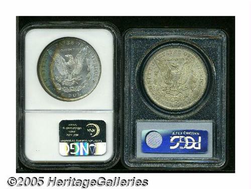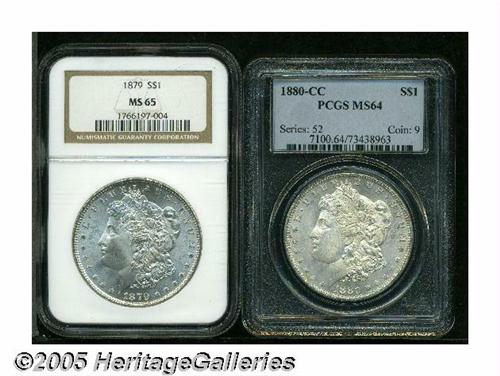 <B>1879<S$1> MS65 NGC.</B></I> Bright obverse, and crescent-toned reverse with olive, blue and gold, well preserved; and a <B>1880-CC MS64 PCGS,</B></I> Frosty surfaces, the reverse is milk-grey with spots of olive, and free of distractions for the grade.