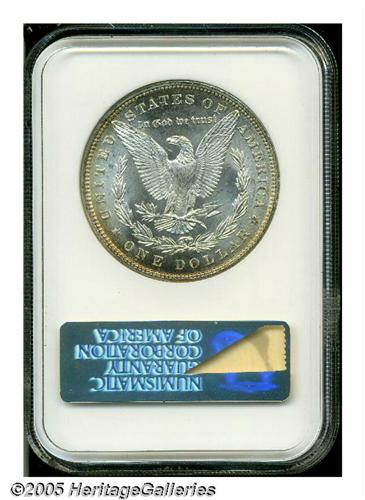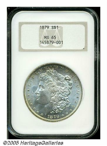 <B>1879<S$1> MS65 NGC.</B></I> With a business strike mintage of nearly 15 million pieces, the 1879 is very common in lower Mint State grades. MS64 coins are scarce, and MS65 pieces become more difficult. The Gem specimen we offer in this lot displays light golden-brown peripheral toning, which is more complete on the reverse. The design elements are nicely struck, and the well preserved, lustrous surfaces exhibit just a few minor ticks on Liberty's cheek, and a couple of minute marks in the upper reverse field. NGC has graded only 37 pieces finer (4/05).<BR><I>From The Clifford Columbus Collection.</B></I>