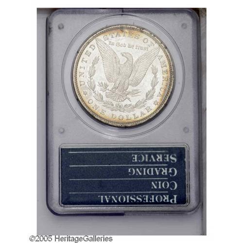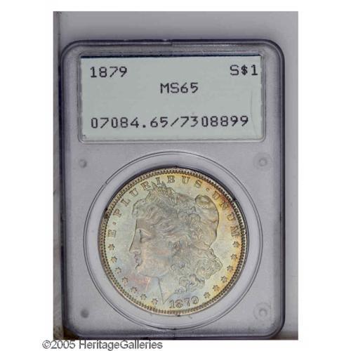 <B>1879<S$1> MS65 PCGS.</B></I> A rich layer of multicolored toning covers the obverse. The reverse is mostly brilliant, save for slight russet peripheral patina. Well struck with just a few small marks on either side. A scarcer date at or above the MS65 level. Enclosed in a first-generation PCGS holder.