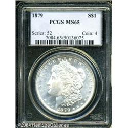 1879 S$1 MS65 PCGS. A well struck and semi-proofli <B>1879 S$1 MS65 PCGS.</B></I> A well struck and semi-prooflike Gem that has wispy tan patina and a well preserved obverse. In this grade, many times scarcer than its San Francisco counterpart. <BR><BR><B>Important notice:</B> Heritage usually auctions material at the rate of 200-250 lots per hour. On some occasions eBay Live bid software or the Internet may not be able to keep up with the pace of the auction. We recommend placing a realistic absentee bid now as insurance to avoid disappointment. Occasionally the auctioneer may eliminate or reject an eBay Live bid, and the auctioneer may also reopen a lot after the close of the eBay live bidding (usually because we missed an audience bid), and may reject your bid even if it shows you as the winning bidder. By bidding via eBay Live, you agree that Heritage may award the lot to another bidder at its sole discretion under the circumstances described above or any other reasonable circumstances. Since eBay bids are not shown to us until we open the lot on the floor, we treat those bids just like floor bids. In most cases the floor responds before the eBay bid is presented to us, due to Internet lag time, so for consistency we have made it a policy that floor bids are always considered first over tie eBay live bids. Also please note that all Heritage lots purchased through eBay Live carry a 20% Buyer's Premium. Please make sure you read the Terms and Conditions before you bid. This lot is being auctioned in conjunction with a live floor auction by Heritage Galleries & Auctioneers. All final auction and invoice information will be supplied by Heritage Galleries & Auctioneers, and all other information should be considered preliminary. Lot:7318