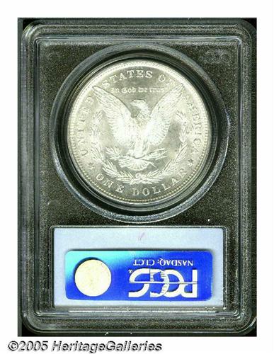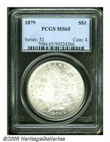 <B>1879<S$1> MS65 PCGS.</B></I> The mint luster on this coin is overpowering and undoubtedly the main reason for its Gem grade. Brilliant throughout, the strike is strong and there are no mentionable abrasions on either side.