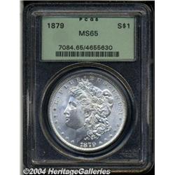 <B>1879<S$1> MS65 PCGS.</B></I> A bold striking with lovely snowy-white surfaces that are just a few paper-thin luster grazes on the portrait from an even higher classification. <BR><BR><B>Important notice:</B> Heritage usually auctions material at the rate of 200-250 lots per hour. On some occasions eBay Live bid software or the Internet may not be able to keep up with the pace of the auction. We recommend placing a realistic absentee bid now as insurance to avoid disappointment. Occasionally the auctioneer may eliminate or reject an eBay Live bid, and the auctioneer may also reopen a lot after the close of the eBay live bidding (usually because we missed an audience bid), and may reject your bid even if it shows you as the winning bidder. By bidding via eBay Live, you agree that Heritage may award the lot to another bidder at its sole discretion under the circumstances described above or any other reasonable circumstances. Since eBay bids are not shown to us until we open the lot on the floor, we treat those bids just like floor bids. In most cases the floor responds before the eBay bid is presented to us, due to Internet lag time, so for consistency we have made it a policy that floor bids are always considered first over tie eBay live bids. Also please note that all Heritage lots purchased through eBay Live carry a 20% Buyer's Premium. Please make sure you read the Terms and Conditions before you bid.