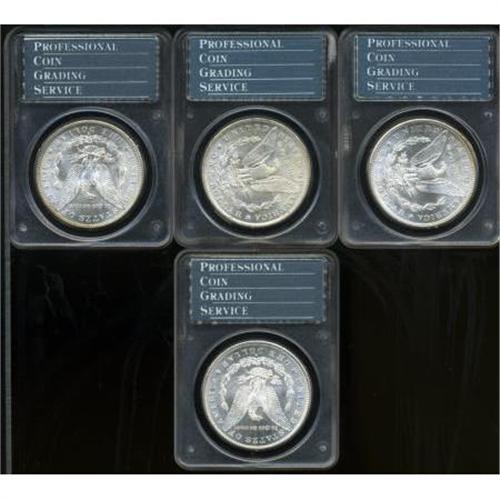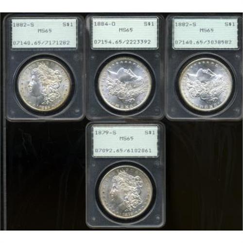 <B>1879-S $1 MS65 PCGS; (2)1882-S MS65 PCGS </B></I>and a<B> 1884-O MS65 PCGS. </B></I><BR><BR><B>Coin Engraver:</B> George T. Morgan<BR><BR><b>Shipping:</b> Coins & Currency (<a target="_blank" href="http://www.heritageauctions.com/common/shipping.php">view shipping information</a>)