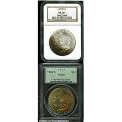 <B>1879-S<img border='0' src='http://www.heritagecoins.com/images/star.gif' width=10 height=10>$1 MS66 <img border='0' src='http://www.heritagecoins.com/images/star.gif' width=10 height=10> NGC,</B></I> an arc of yellow-gold, crimson, plum, and emerald-green toning adorns the left side of the obverse; and a <B>1882-S MS65 PCGS,</B></I> beautiful sea-green and pink-red iridescence blankets the obverse. 2 Coins