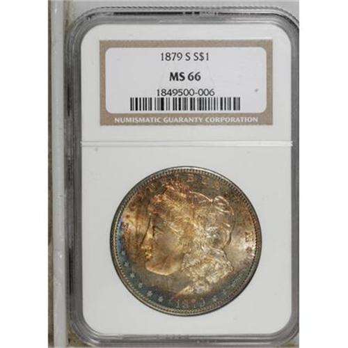 <B>1879-S $1 MS66 NGC.</B></I> Deep amber-gold toning dominates this lustrous Premium Gem, although the margins offer sea-green and navy-blue iridescence. Well struck and beautifully preserved. <BR><BR><b>Shipping:</b> Coins & Currency (<a target="_blank" href="http://www.heritageauctions.com/common/shipping.php">view shipping information</a>)