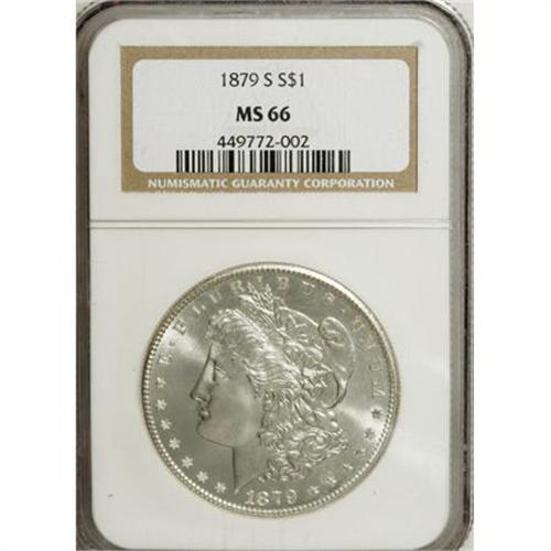 <B>1879-S $1 MS66 NGC.</B></I> NGC Census: (5425/1705). PCGS Population (5582/1097). Mintage: 9,110,000. Numismedia Wsl. Price for NGC/PCGS coin in MS66: $248. (#7092)<BR><BR><B>Coin Engraver:</B> George T. Morgan<BR><BR><b>Shipping:</b> Coins & Currency (<a target="_blank" href="http://www.heritageauctions.com/common/shipping.php">view shipping information</a>\)